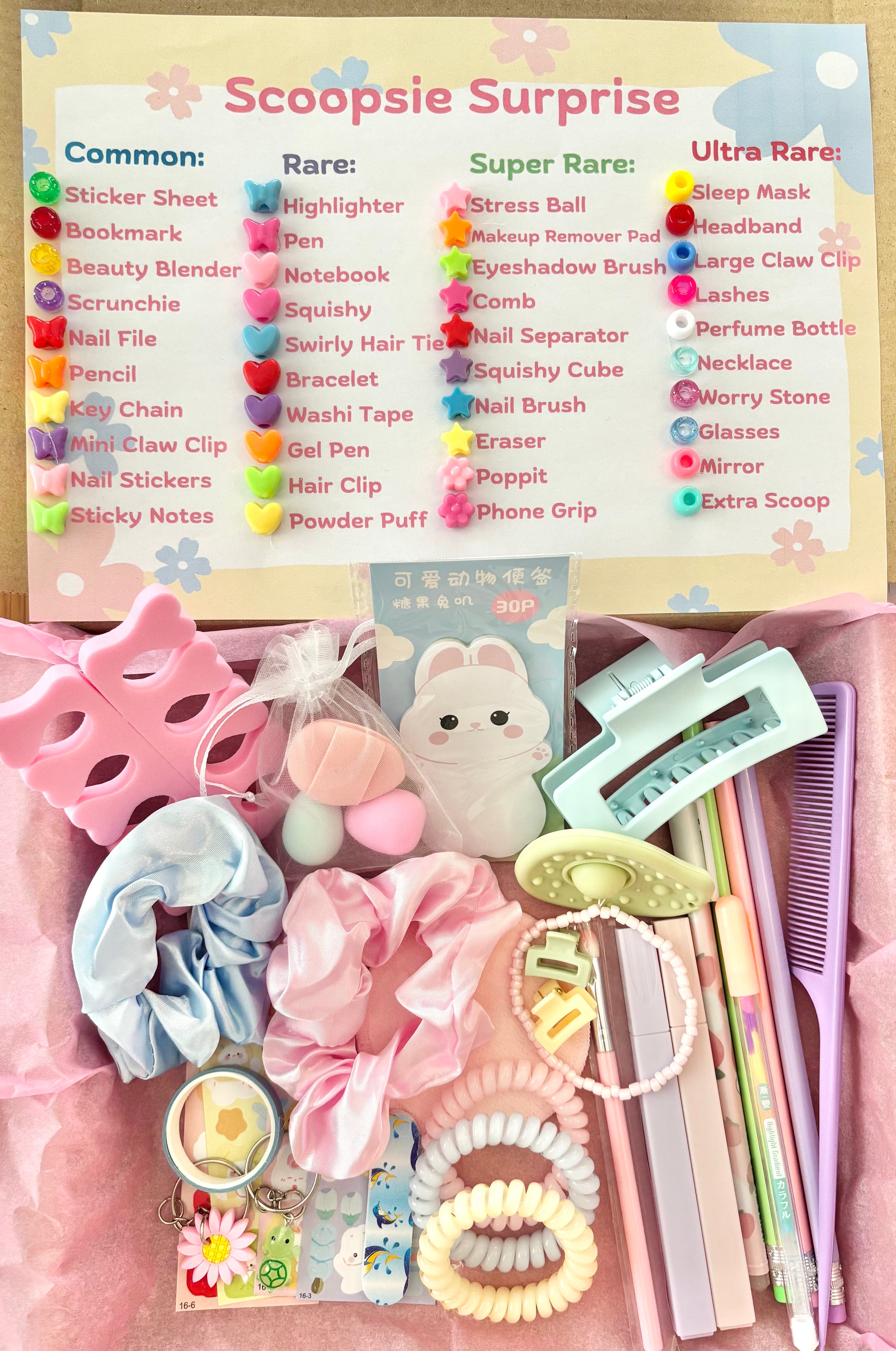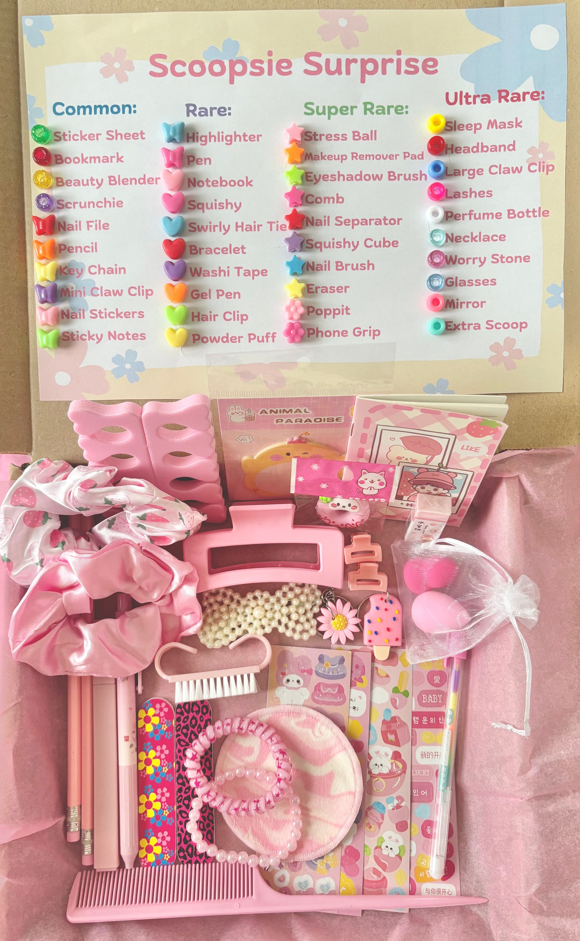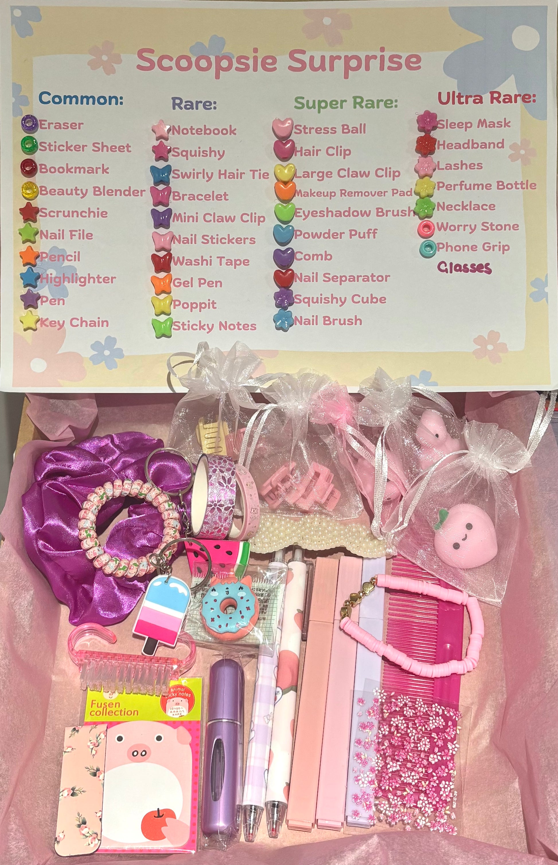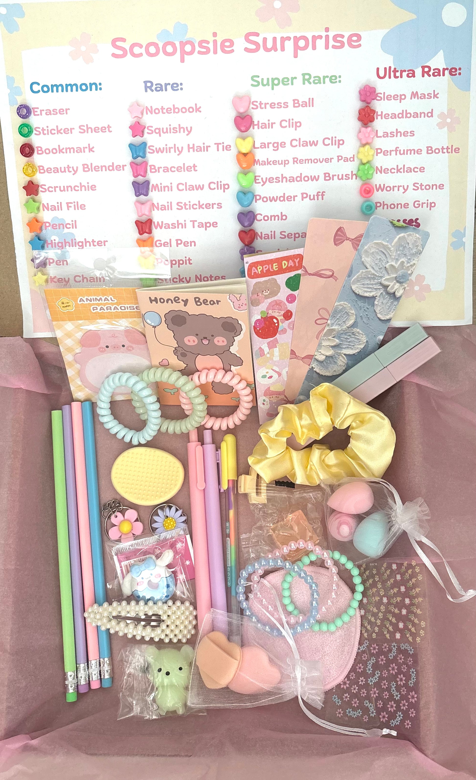 - Surprise products include Erasers, Sticker sheets, Bookmarks (magnetic or card), Beauty Blenders, Scrunchie's, Nail Files, Pencils, Highlighters, Pens, Key Chains, Mini notebooks, Squishys, Swirly hair ties, bracelets, mini claw clips, nail stickers, washi tape, gel pens, poppits, sticky notes, stress ball, hair clips, claw clips, makeup remover pads, eyeshadow brush, powder puff, comb, nail seperators, squishy cube, nail brush, sleep mask, headband, lashes, perfume bottle, necklace, worry stone, mirror & sunglasses. Subject to availability.