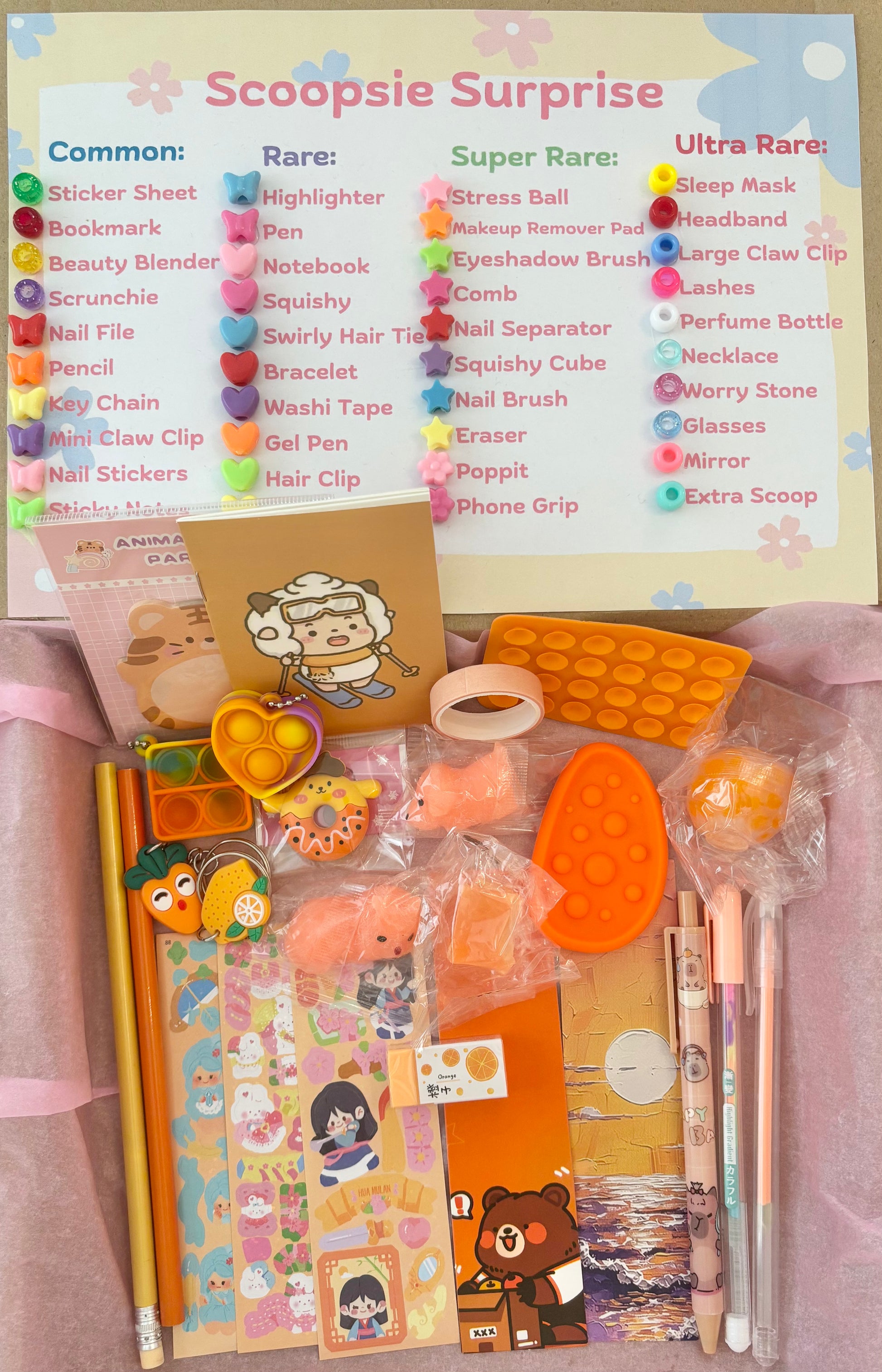 • Each scoop is crafted from a random lucky dip! Every surprise item is symbolised by a different colour or shape bead. What's inside depends on your scoop—no guarantees. From Scrunchies, to squishy’s to pencils, who knows what you will get 🎉